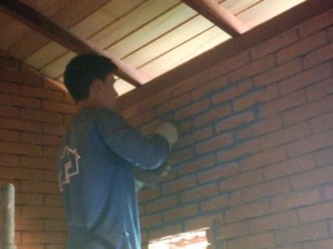 Construção com tijolo ecológico – Aplicação de argamassa para rejuntamento (obra em Vassouras/RJ)
